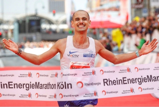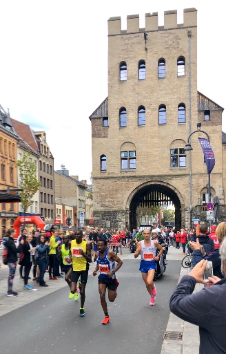 Mein Betreuerstab mit Coach Tono, meinem Freund Johannes Eisinger aus Herxheim und Dominik Fabianowski, der mir die Getränke anreichen sollte, war super aufgestellt. Zudem waren dutzende Freunde und meine Familie an der Strecke. Ich war bereit und wir waren auf Kurs. Zunächst noch ein paar Sekunden über dem Olympia-Tempo und ab Kilometer 10 genau drauf. Ich fühlte mich locker und bislang lief alles rund. Mich störte lediglich, dass meine Tempomacher zu dritt nebeneinander liefen, anstatt sich gegenseitig zu schützen. Wir würden unsere Energie sicherlich noch brauchen. Leider verstanden meine Tempomacher diese Anweisung mehrfach nicht und ich beschloss, wieder in den Konzentrationstunnel zurückzukehren. Die Stimmung war gewaltig, vor allem, als das große Feld mir entgegenkam. Gefühlt wusste jeder auf der Strecke, wer ich bin. Köln ist echt zu meinem Wohnzimmer geworden.