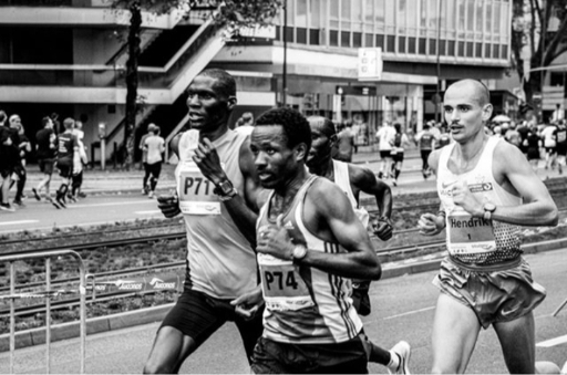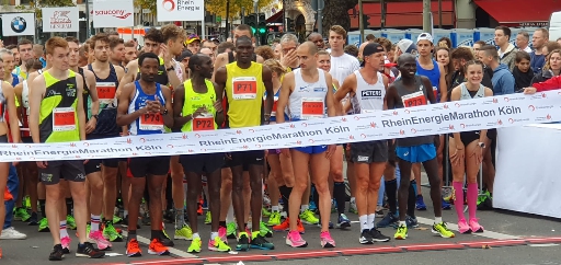 In dieser Mischung aus Druck und Vorfreude gelang es mir am Start dennoch sehr gut, die Konzentration zu wahren und die enorme Zuschauerresonanz in positive Energie umzuwandeln. So viele aufmunternde Worte und Schulterklopfen – Kölns tolles Publikum ist ein absoluter Trumpf dieses Marathons. Dann ging es los! Energie sparen und mich hinter den Tempomachern verstecken war die Devise auf der ersten Streckenhälfte. Meine drei kenianischen Pacer kannte ich zum Teil gut und ich war zuversichtlich wie abgesprochen bis Kilometer 35 begleitet zu werden. Dies sollte ein wichtiger Faktor sein, denn schon auf der Rheinbrücke bei Kilometer 1 merkte ich, wie stark der Wind heute blies.
